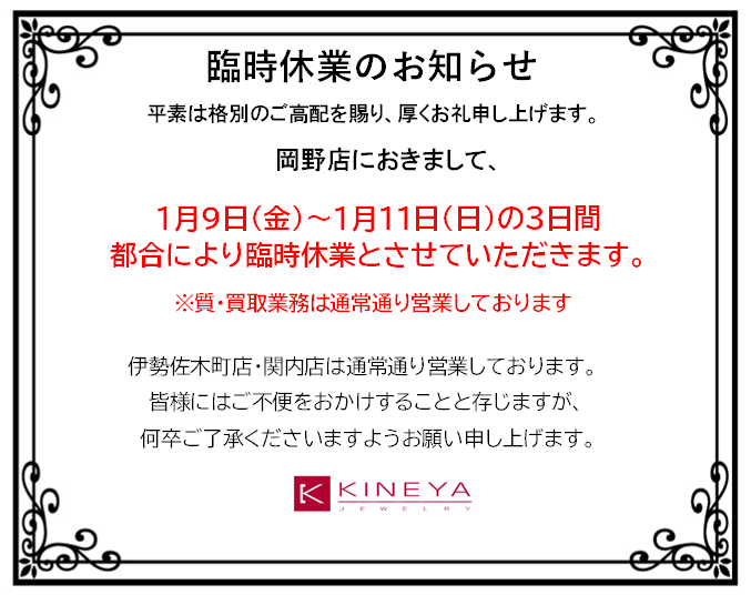 岡野店臨時休業のお知らせ NEWS | 2026.1.3 tweet facebook B!はてブ LINE Google+ 日頃よりキネヤをご利用いただきありがとうございます。 岡野店におきまして、都合により1月9日(金)〜1月11日(日)の3日間、販売業務を臨時休業させていただきます。 ※尚、岡野店質買取業務・関内店・伊勢佐木店は通常通り営業しております。 ご不便をお掛け致しますが、何卒ご了承のほどよろしくお願い申し上げます。 tweet facebook B!はてブ LINE Google+ PREV Related Postsブルーゾイサイトお買い取り(^^)お買い取り(^^)